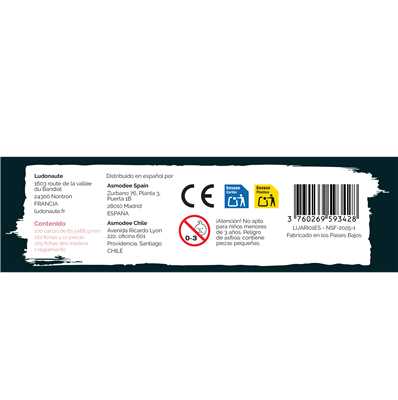 100 cartas de 63,5×88,9 mm, 162 fichas y 12 piezas, 109 fichas des madera, 1 reglamento