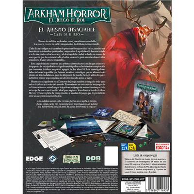Hasta cinco jugadores y un Director de Juego pueden arriesgarlo todo para salvar Arkham y el resto del mundo. Tanto si eres un veterano de los juegos de rol como si nunca antes has participado en un juego de narración compartida, esta caja de inicio es el medio ideal para explorar la ambientación de Arkham Horror, y viene repleta de componentes y ayudas de juego que te permitirán vivir una experiencia inolvidable.