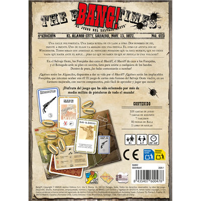 ¿Quiénes serán los Alguaciles, dispuestos a dar su vida por el Sheriff? ¿Quiénes serán los implacables Forajidos, que intentan acabar con él? El juego de cartas más famoso del Salvaje Oeste vuelve, en un formato mejorado, con nuevos componentes, ¡más fácil de aprender y jugar que nunca!