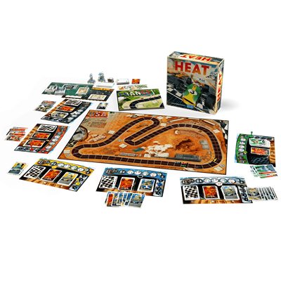2 tableros gigantescos de doble cara (4 Circuitos), 4 cartas de Circuito, 6 Coches de carreras con sus correspondientes peones de Caja de cambio, 6 tableros de Piloto, 72 cartas de Velocidad, 48 cartas de Motor forzado y 37 cartas de Estrés, 114 cartas de Mejora, 35 cartas de Patrocinio, 10 cartas de Leyenda, 10 cartas de Evento, 1 tablero de Leyendas y 1 tablero de Campeonato, 6 fichas de Clima y 12 fichas de Estado de la pista, 2 fichas de Prensa, 1 bloc de Campeonato, 2 Reglamentos.