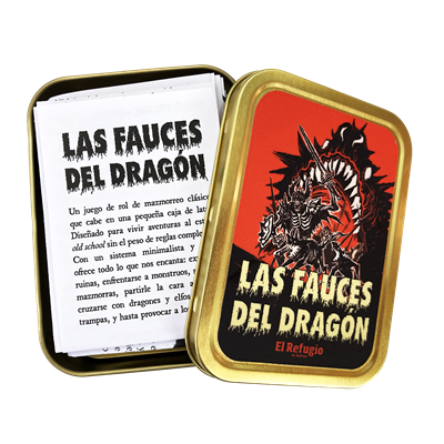 Un juego de mazmorreo clásico que cabe en una pequeña caja de lata. Veteranos y novatos, entrad en Las fauces del dragón y luchad por salir de ellas con vida ¡y con oro!