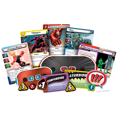 1 cuaderno Aprende a jugar, 1 Guía de referencia, 199 cartas de Jugador, 137 cartas de Encuentro, 7 cartas de referencia, 30 cartas de Estado, 62 fichas de Daño, 33 fichas de Amenaza, 5 fichas de Aceleración, 1 ficha de Jugador inicial, 4 medidores de Vida de jugador, 1 medidor de Vida de Villano y 16 contadores genéricos.